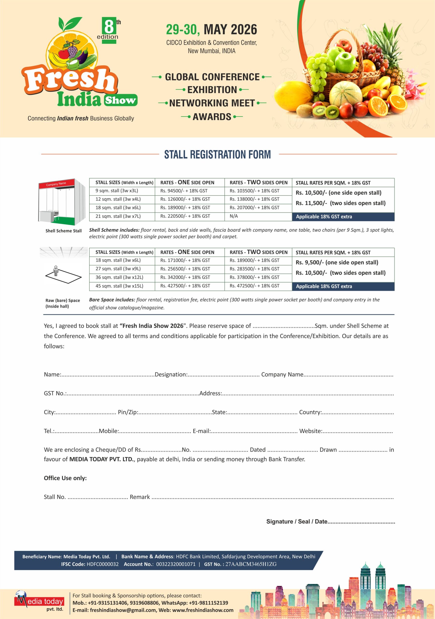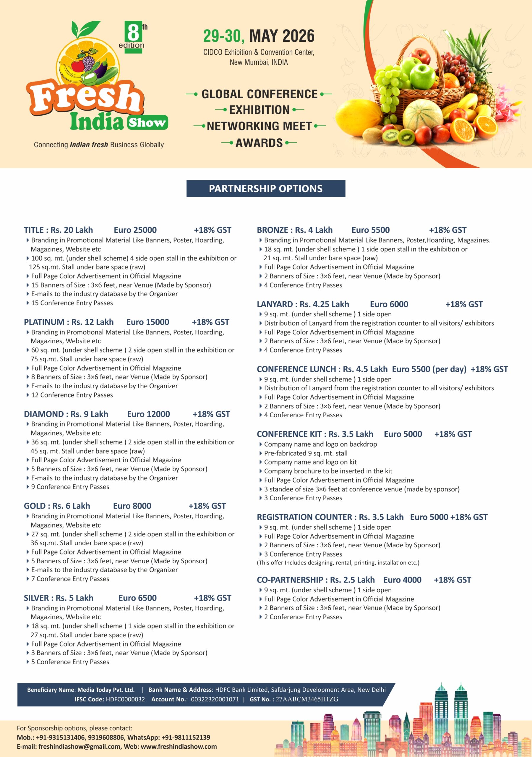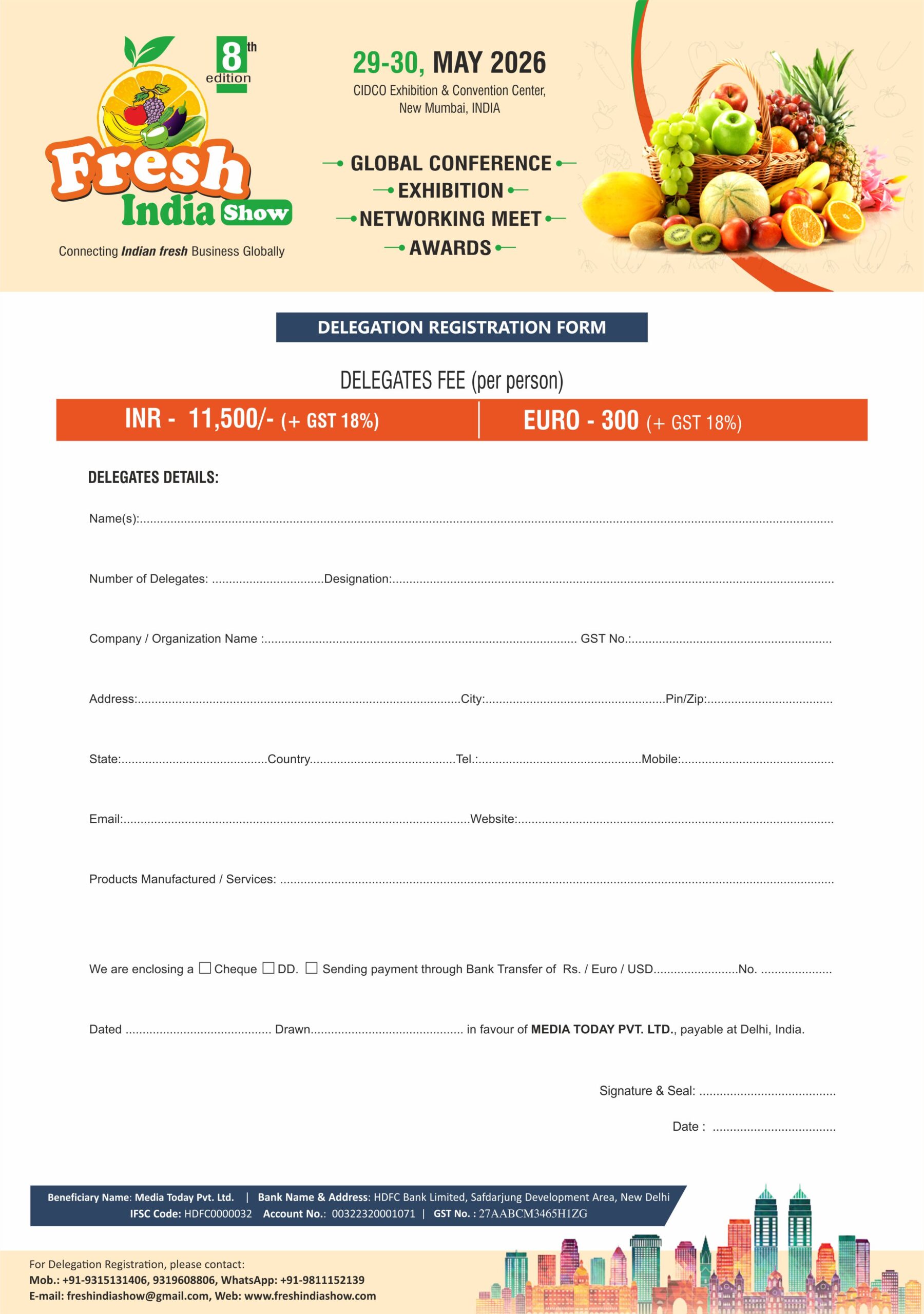 Cultivating Global Partnerships for India’s Fresh Industry with a 15–25% surge in per-capita consumption of fruits and vegetables, India is witnessing remarkable growth in demand for fresh produce, frozen goods, cut & packed products, and beverages. Supply is set to rise further as consumers increasingly prioritize nutrition, prompting growers to boost investments in popular crops like bananas, strawberries, blueberries, and citrus fruits. At the same time, large corporations and high-tech greenhouse and hydroponic projects are elevating India’s horticulture industry through commercialization and innovation. India’s fresh fruit and vegetable exports have expanded significantly in recent years. According to official data, exports of fresh fruits and vegetables reached approximately USD 1.81 billion in FY 2023-24, with major shipments to Bangladesh, UAE, Netherlands, Nepal, Malaysia, Iraq, the UK, and Saudi Arabia. Over the past five years, export volumes jumped by 47.3%, reaching over 123 countries, reflecting both rising global demand and strong export promotion efforts. In recognition of the sector’s expanding domestic and global footprint, Media Today Pvt. Ltd. is delighted to announce the “8th Fresh India Show 2026 (FIS 2026)” on May 29-30, 2026, at the CIDCO Exhibition & Convention Centre in Mumbai. Mumbai, India’s leading fresh produce import/export hub and economic capital — is the ideal venue, given its proximity to the Vashi Fruit Market and its vibrant network of fresh food retailers and distributors. Join industry leaders, decision-makers, producers, wholesalers, importers/exporters, retailers, and cold-chain experts to forge global partnerships, gain market insights, and explore cutting-edge trends that will shape the future of the fresh produce industry worldwide.